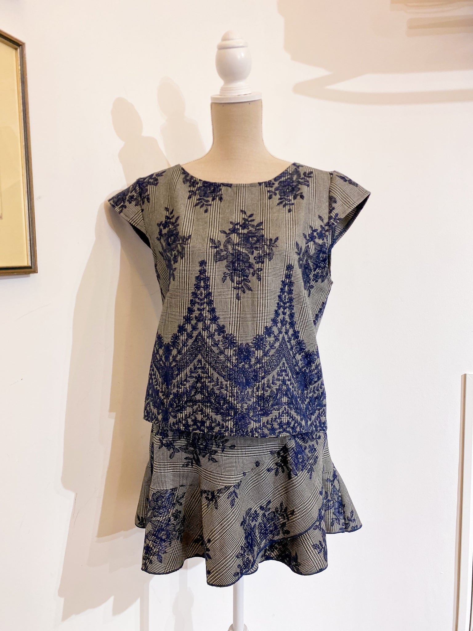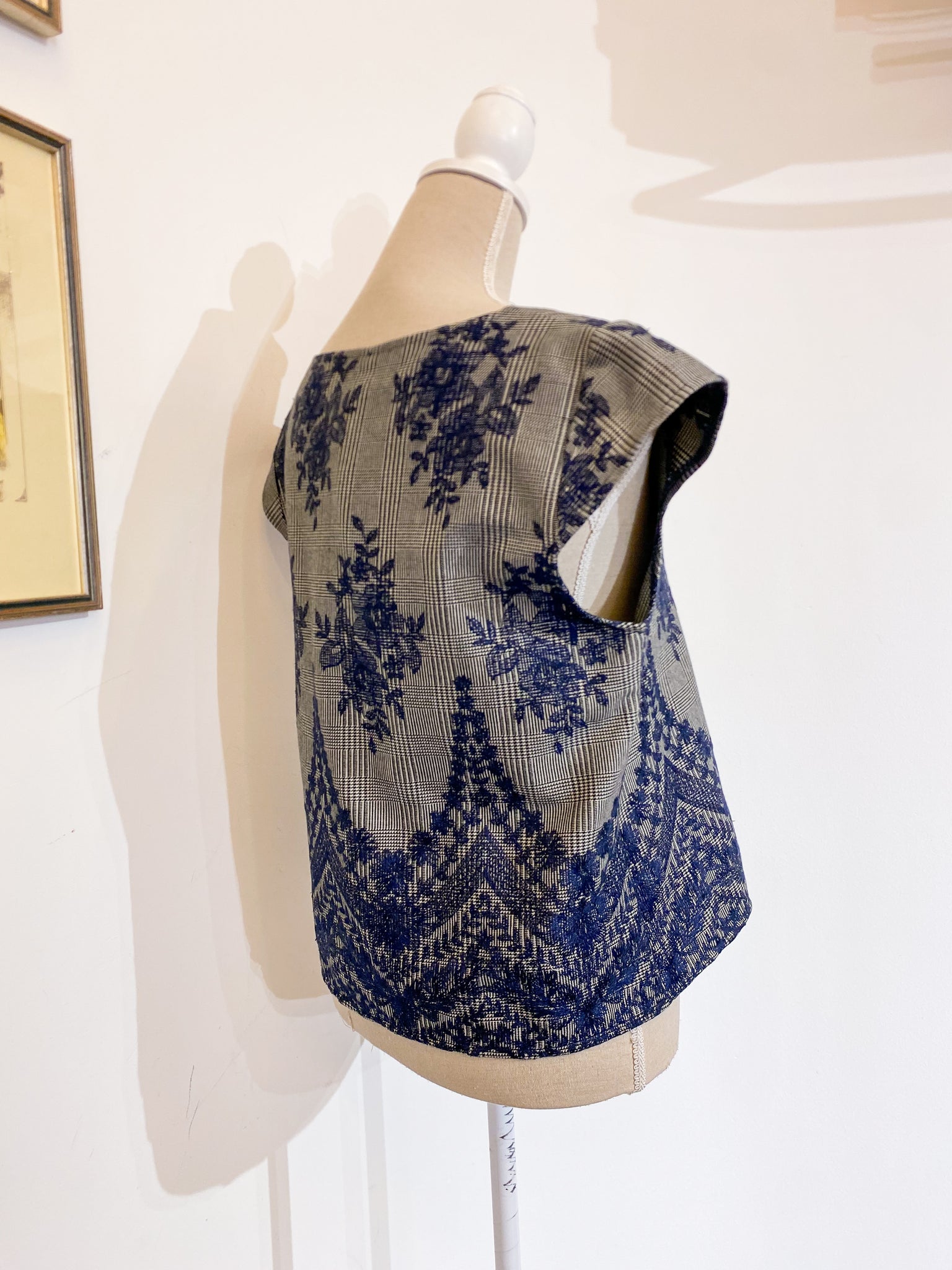 Maglia Chiara Luppi in fantasia principe di Galles bianco e nero, con ricamo a contrasto blu.