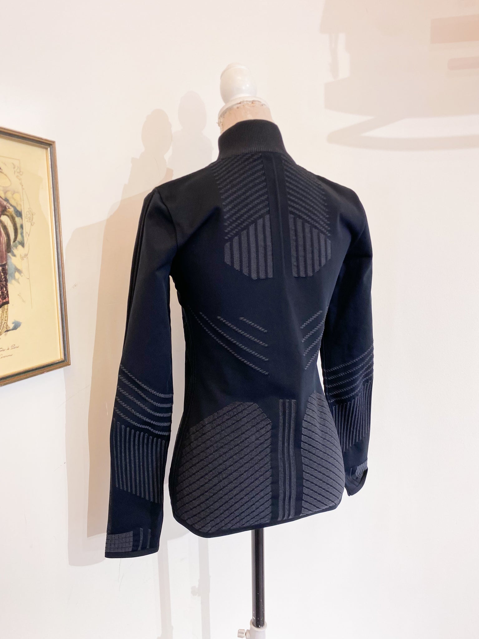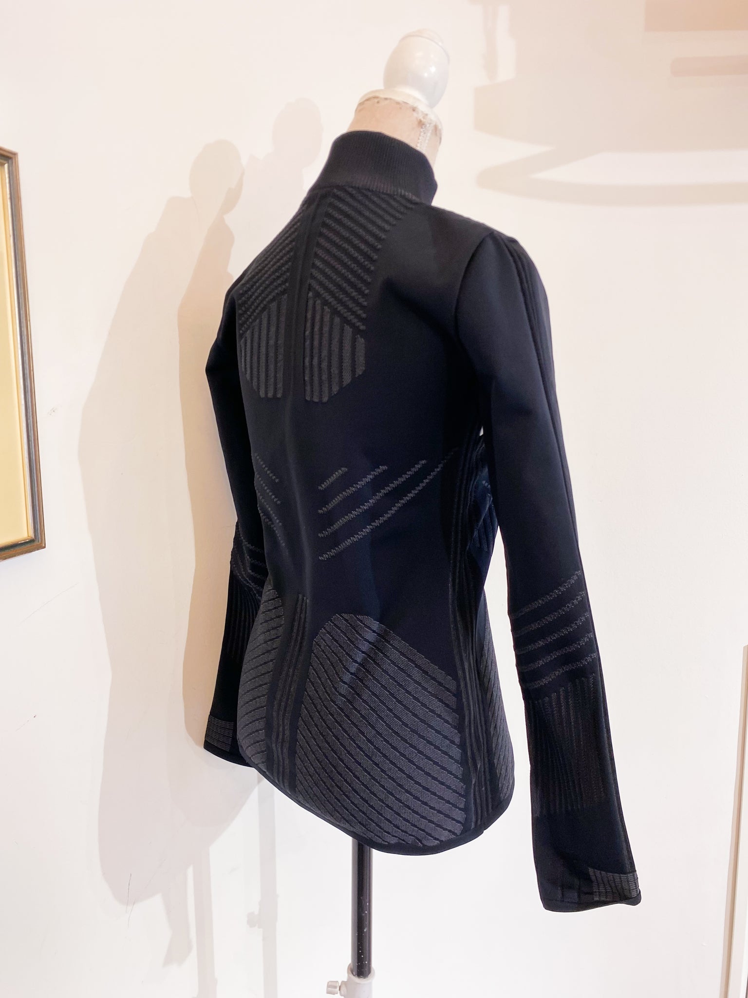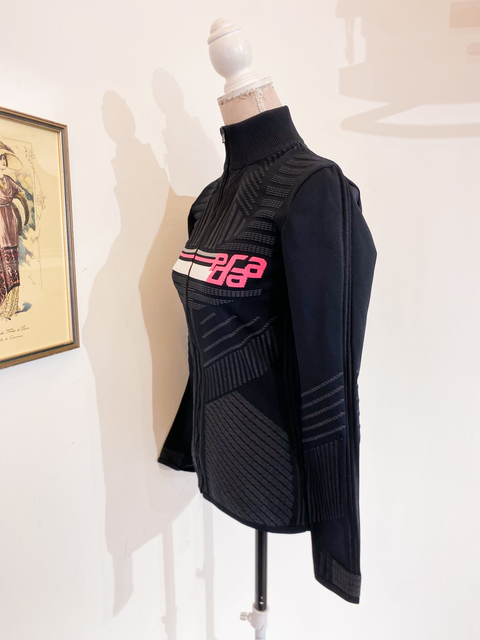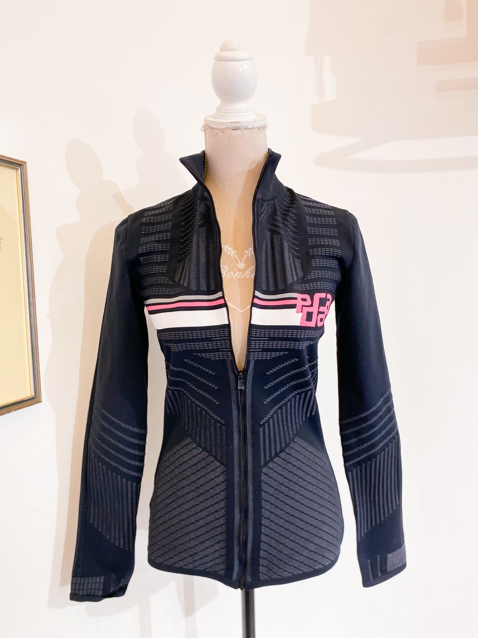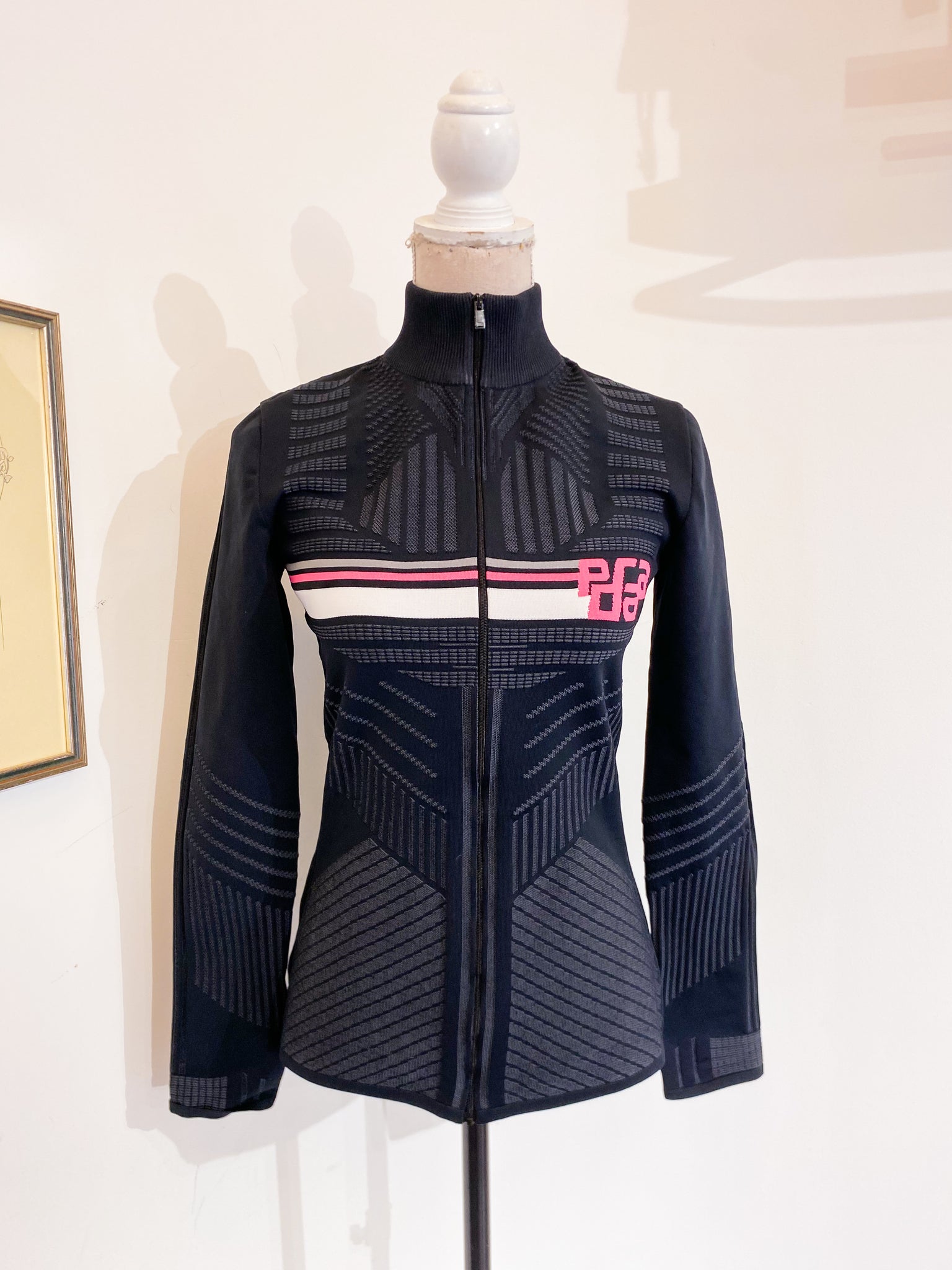 Felpa Prada linea sci in tessuto elasticizzato traspirante, nero/grigio con logo Prada fucsia.