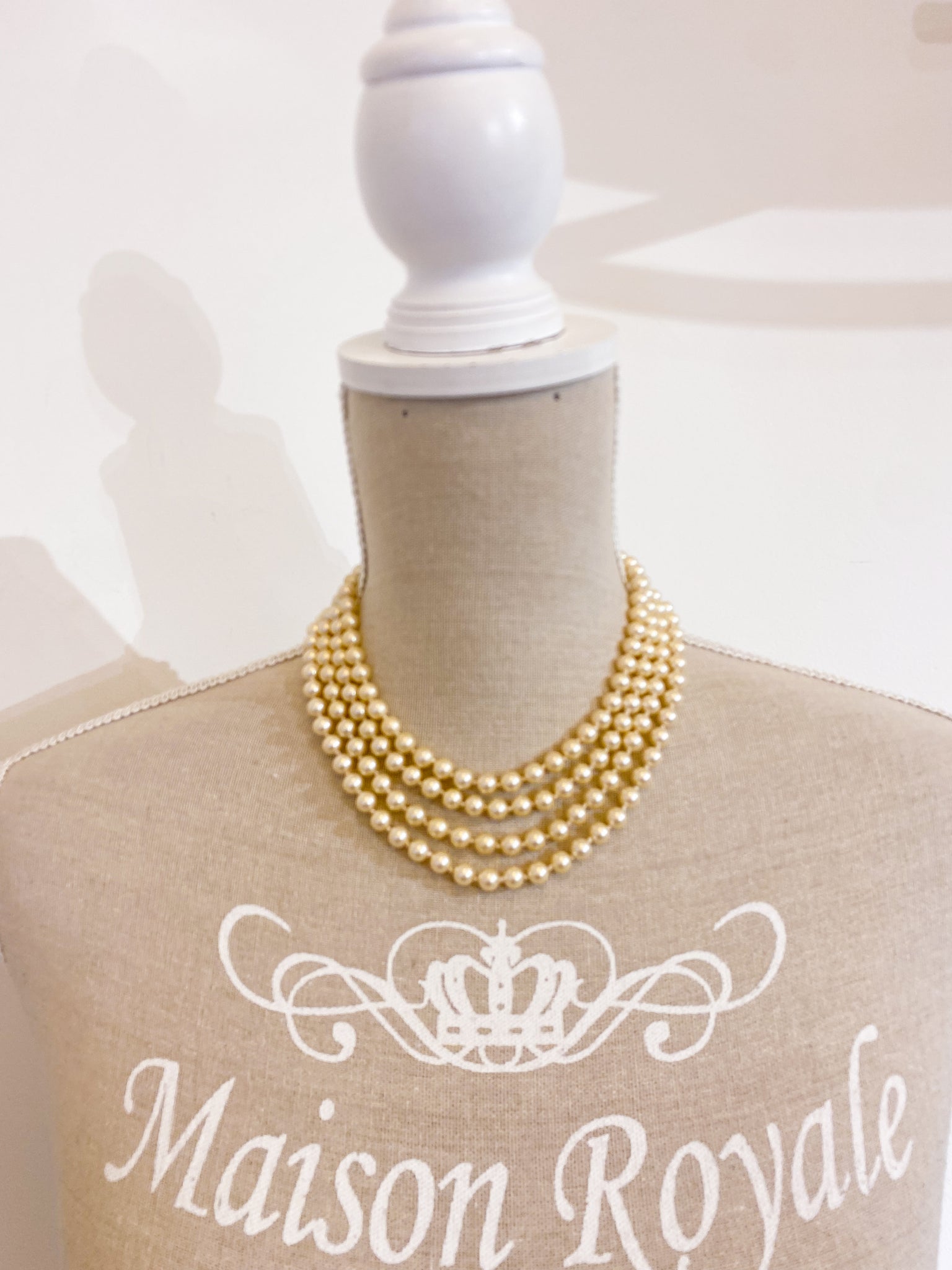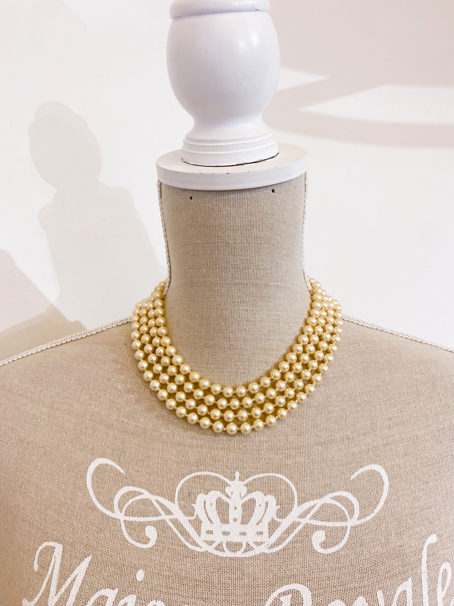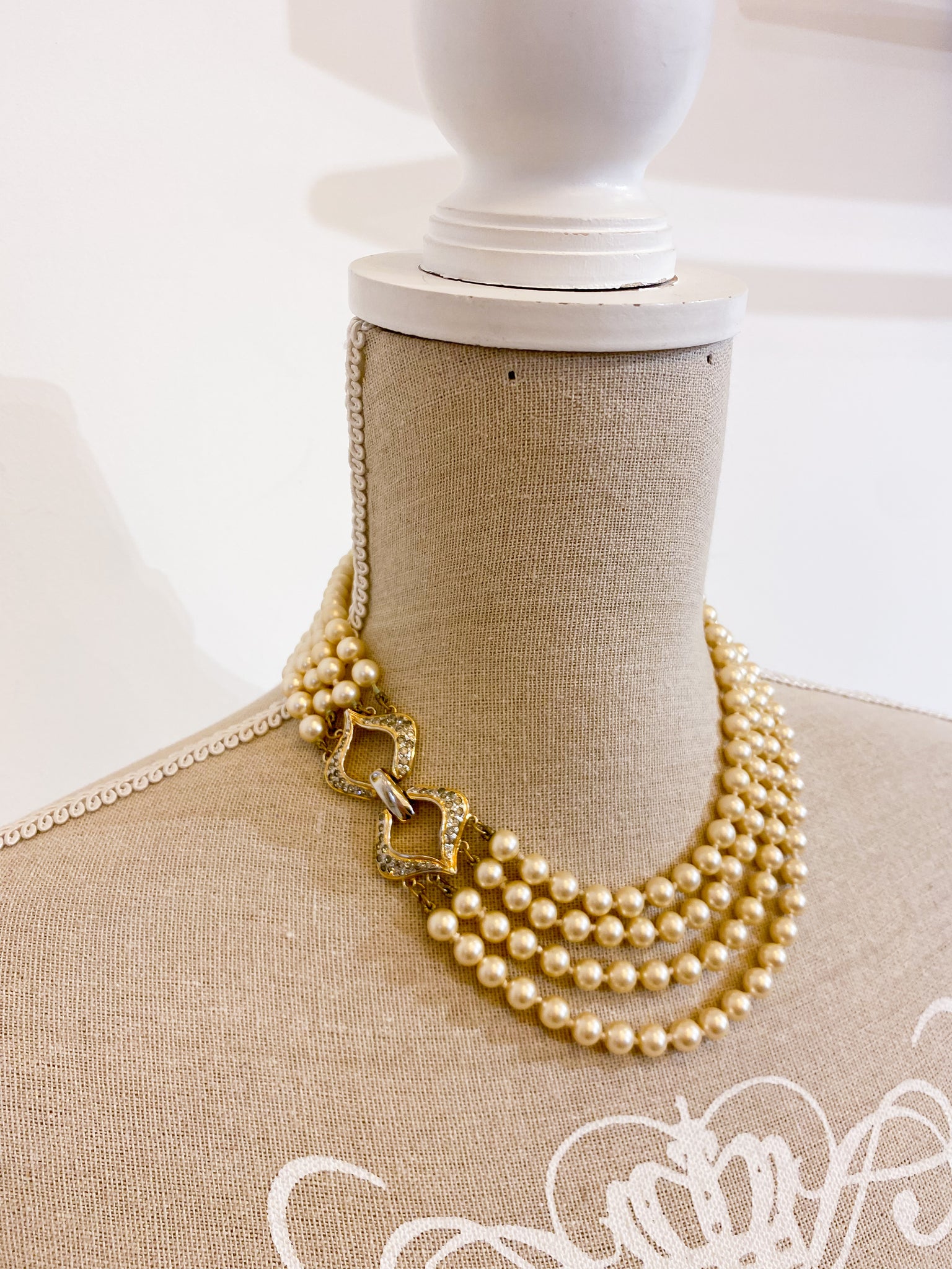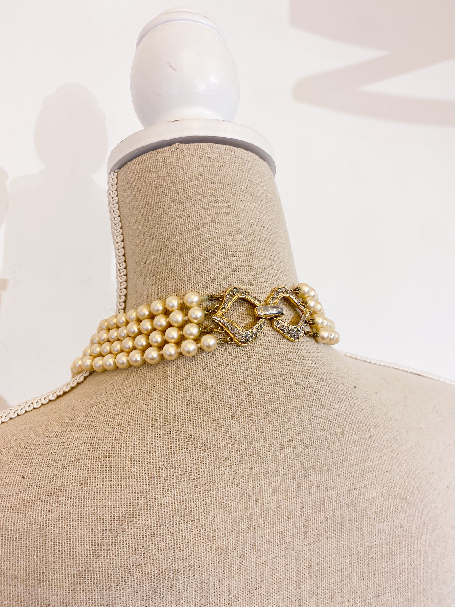 Collana vintage composta da quattro fili di perle artificiali e chiusura gioiello con strace incastonati.