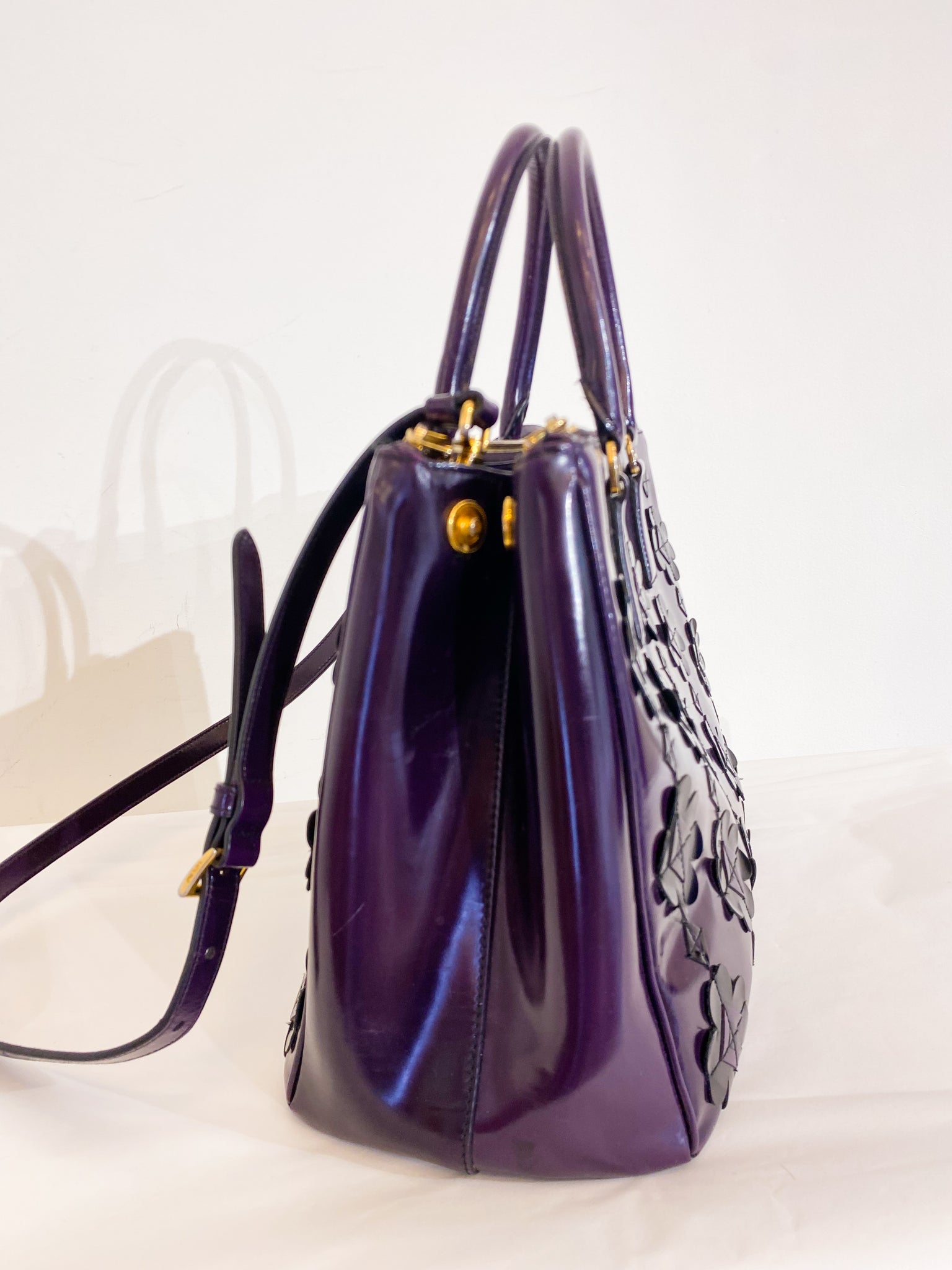 Borsa Prada Galleria double zip in vernice prugna con fiori applicati in vernice nera.