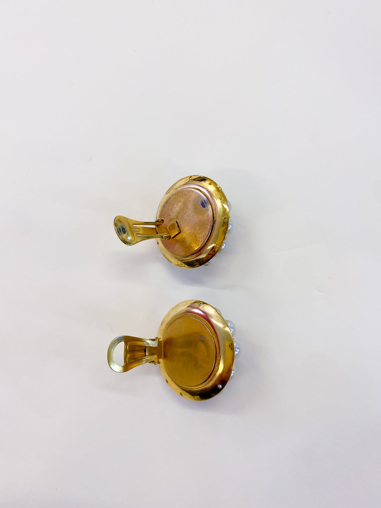 Montatura metallico dorata con applicate perline artificiali e pietra bachelite nera.