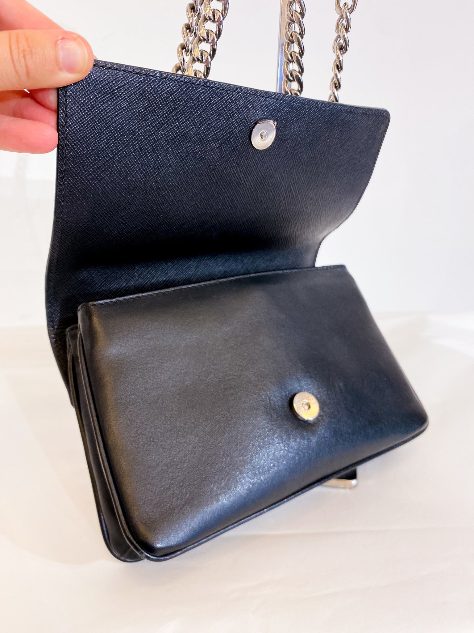 Tracolla a catena metallica argentata con spallaccio in pelle saffiano nera. Può essere portata a spalla opp CrossBody.