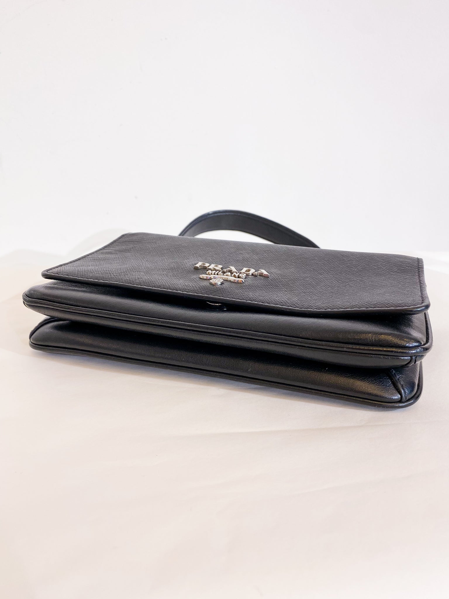 Borsa Pattina a tracolla Prada in pelle soft calf nera doppio scomparto a soffietto e pateletta di chiusura in pelle saffiano.