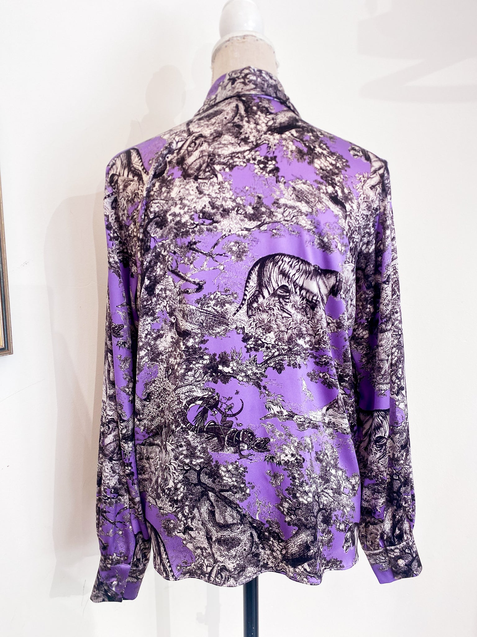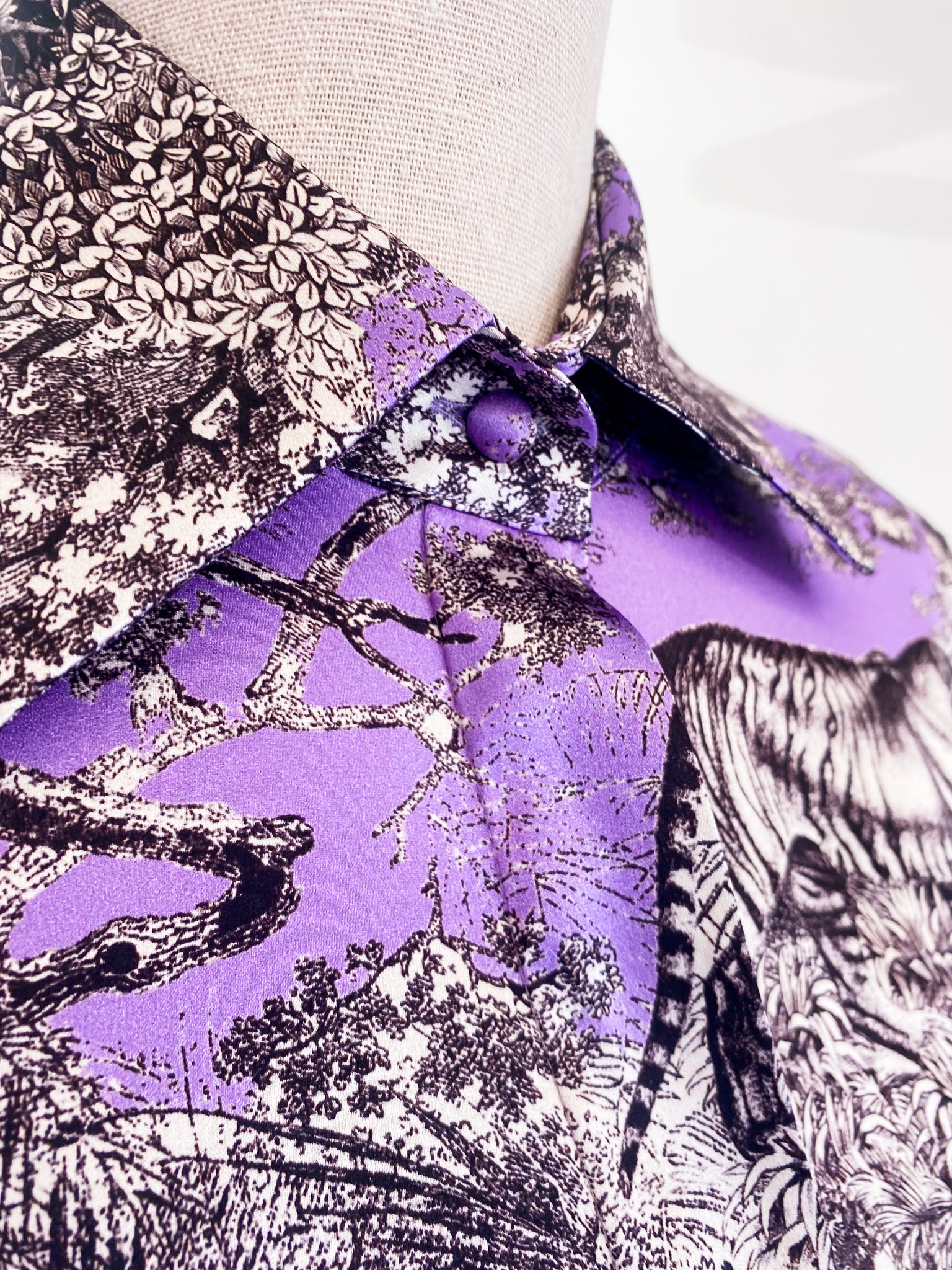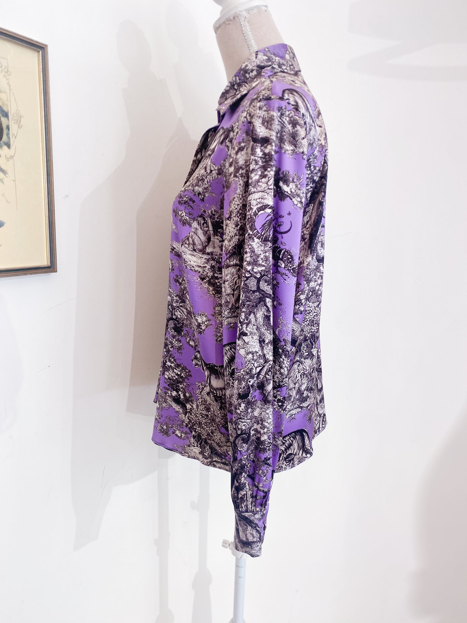 Camicia sartoriale moods, in prezioso raso di seta leggermente elasticizzato. Fantasia Toile de Jouy fondo lilla stampa grigio, bianco e nero.