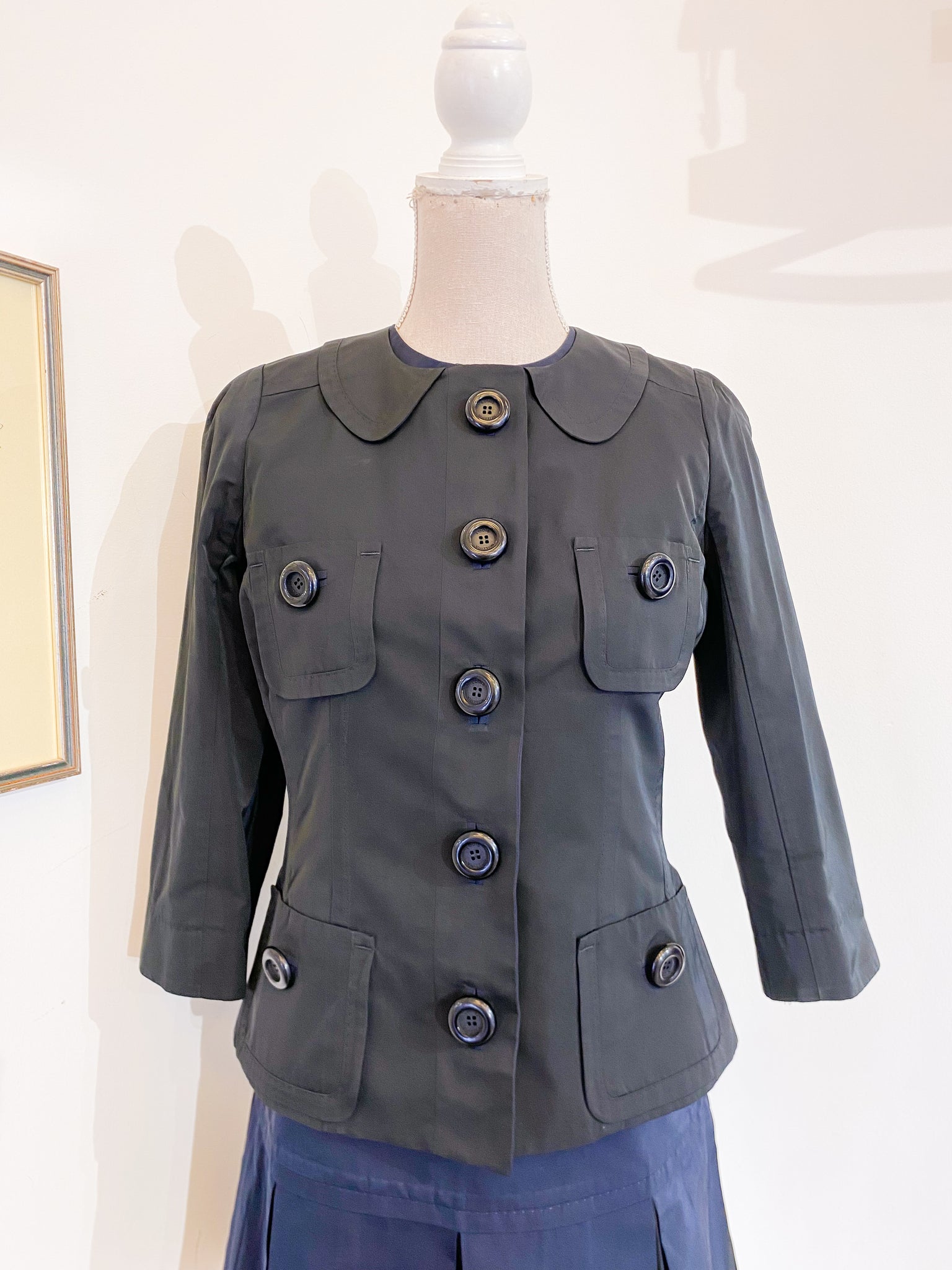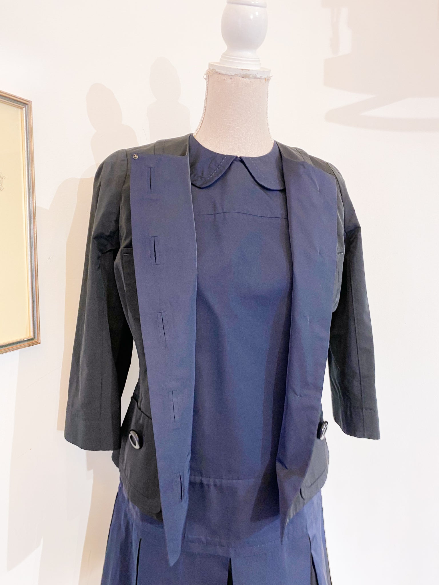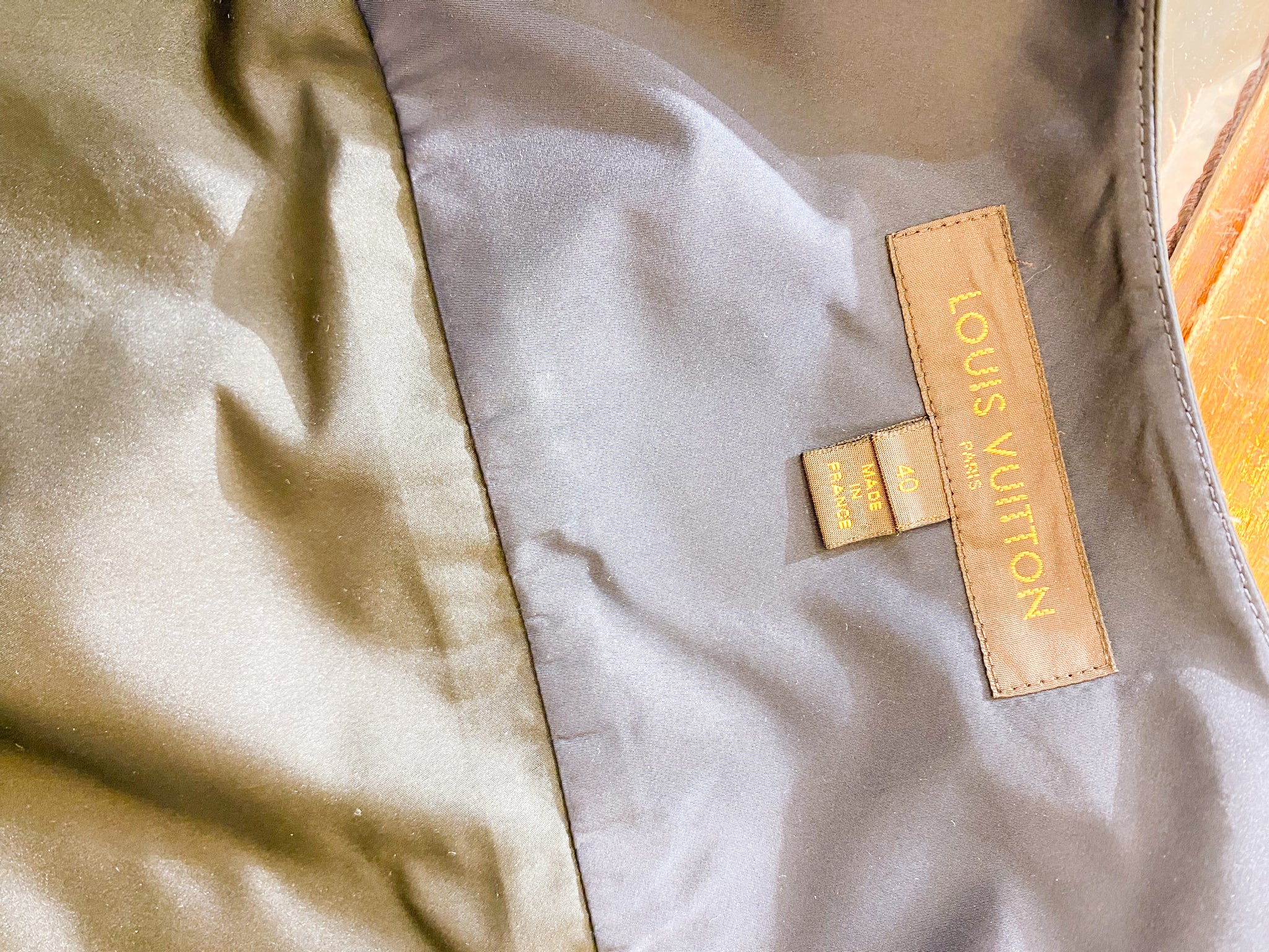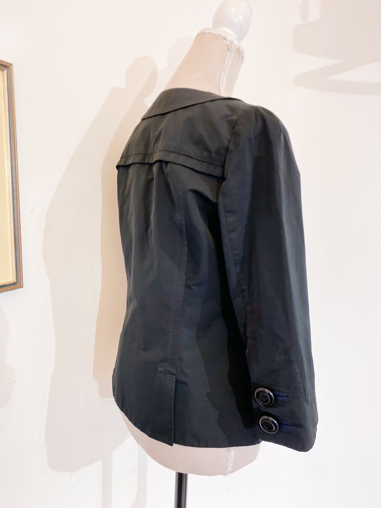 Giacca corta Louis Vuitton in shantung nero con interno a contrasto blu.