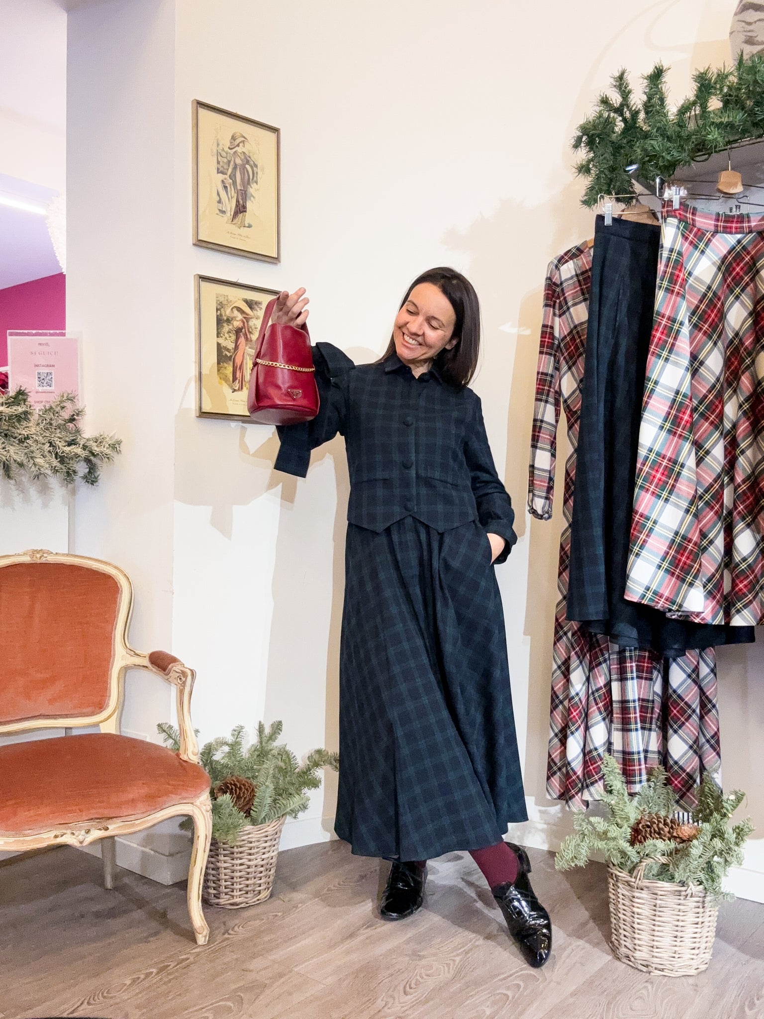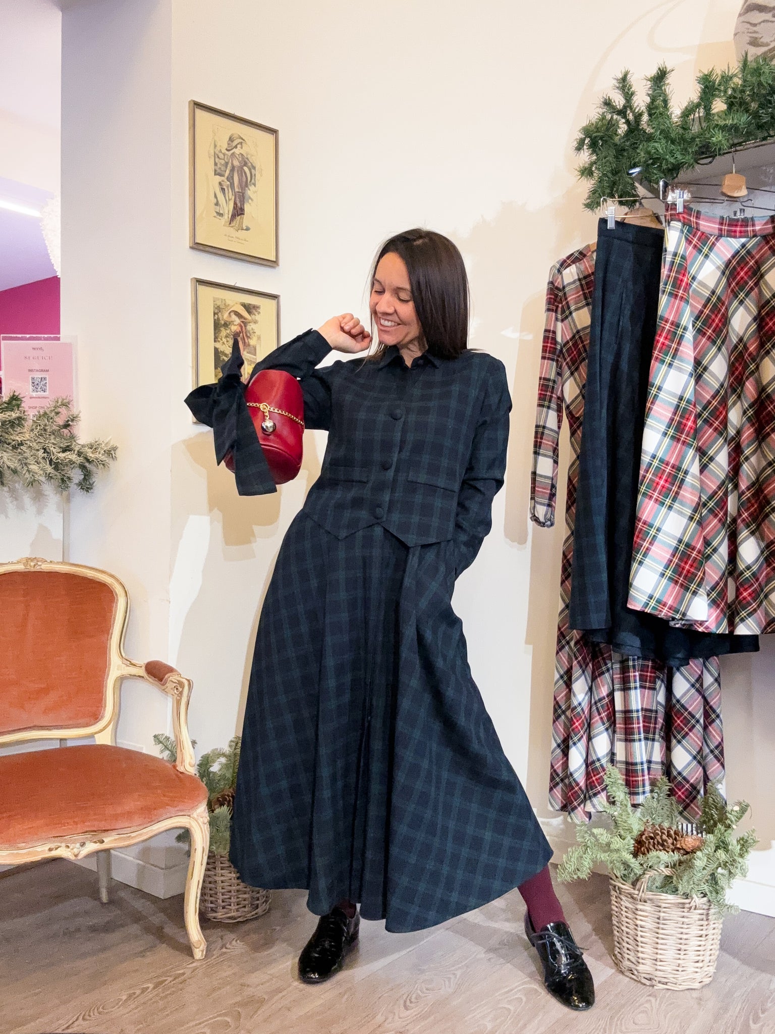 Gilet Sartoriale Moods in lana scozzese fantasia tartan Black Watch. Retro in raso nero.