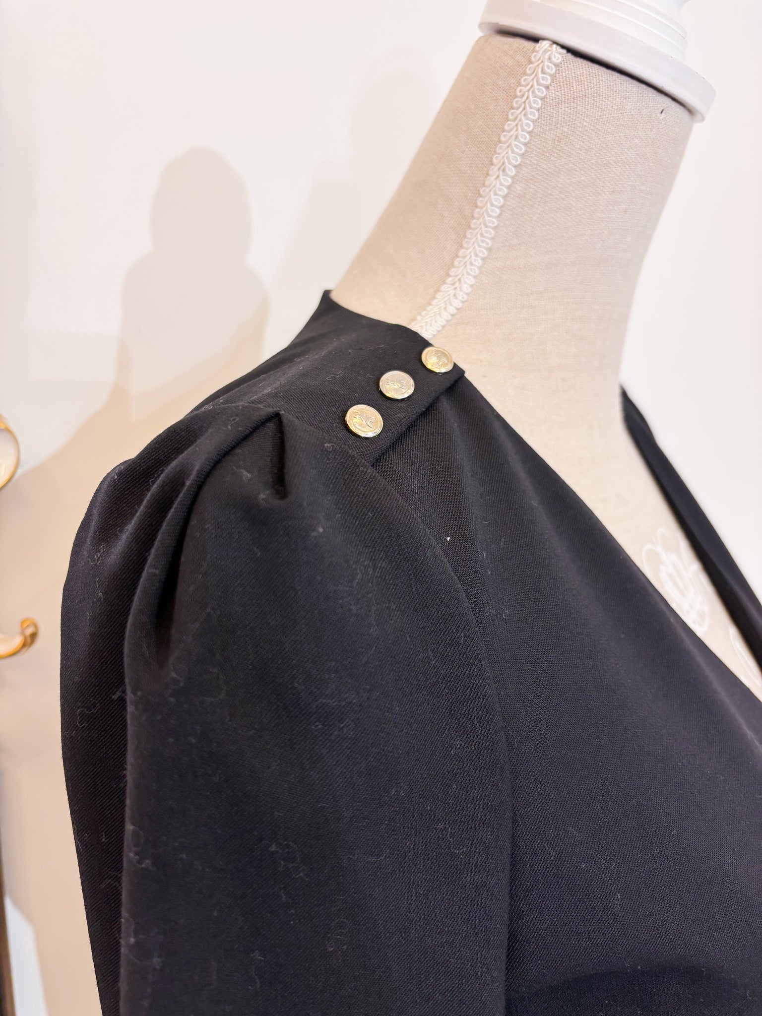 Lo scollo incrociato a V valorizza il décolleté, mentre la vita leggermente sagomata definisce la silhouette.
